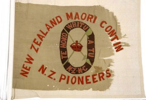 The Pioneer Battalion Flag: Tāhiwi flag is attributed to Captain Pirimi Tāhiwi, a member of the New Zealand Māori (Pioneer) Battalion. In the centre of the flag is a taiaha crossed by a tewhatewha (the spear and long-handled axe-shaped club are both traditional weapons). The wording in the centre says, ‘Te Hoko Whitu a Tu’ (the war party of Tūmatauenga, the god of war) N-Z-N-C (New Zealand Native Contingent). Around the outside it says ‘New Zealand Maori Contin[gent], N.Z. Pioneers’.