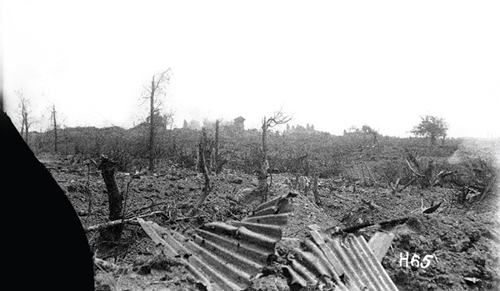 Messines battlefield, Belgium, during World War I, with shells bursting in the distance.